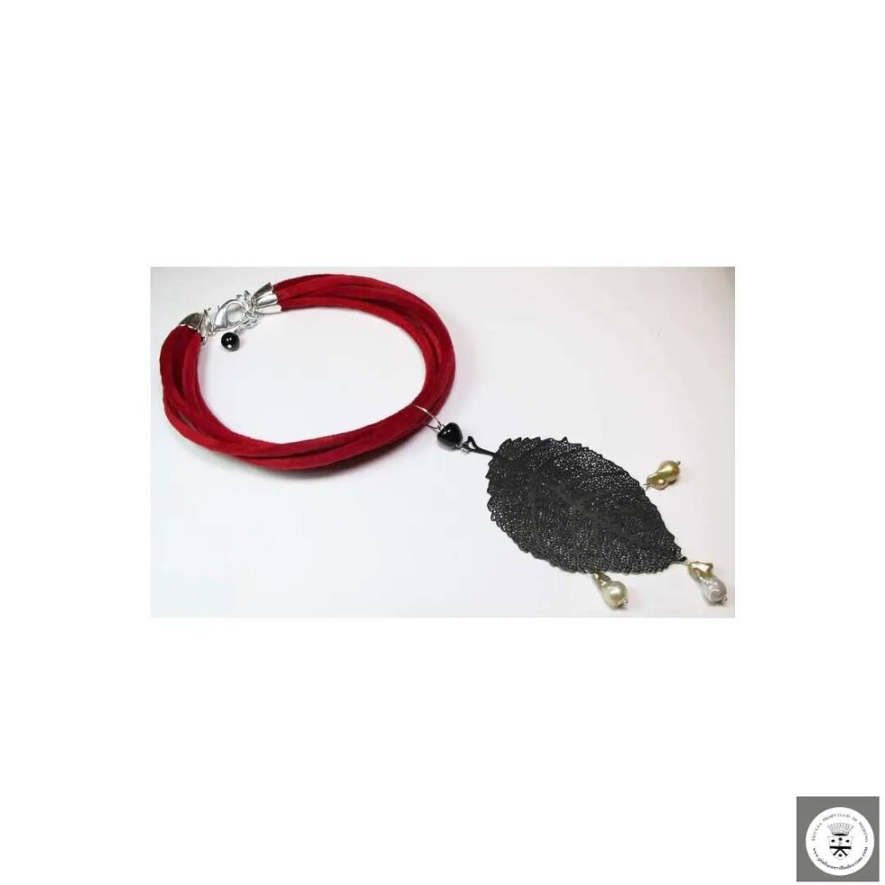 Collana di cinque fili di velluto rosso con foglia smaltata e perle di fiume barocche e onice. Chiusura in acciaio nickel free con onice e catena in alluminio. Chiusura in acciaio nickel free con onice e catena in alluminio.