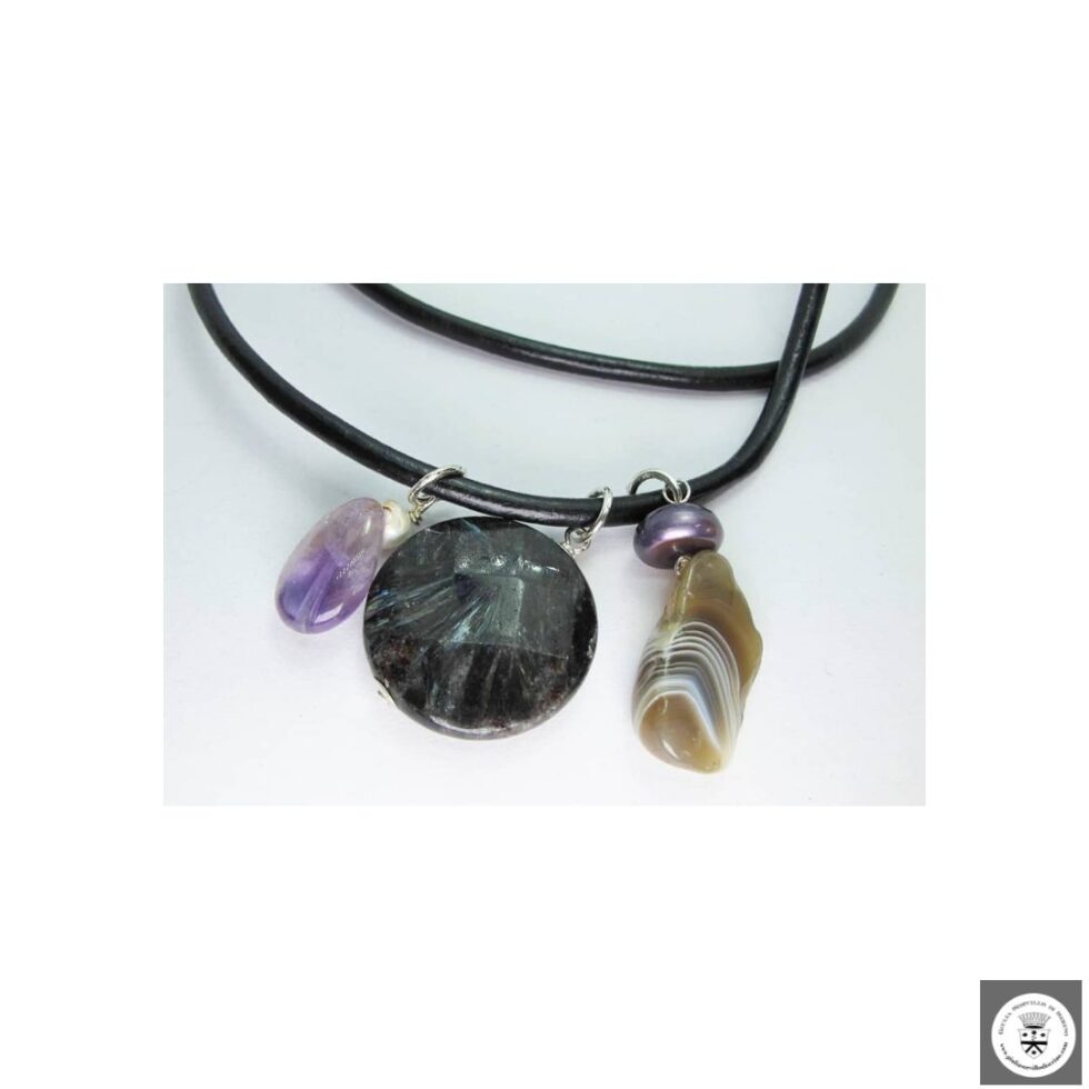 Collana di due fili in pelle nera con perla barocca, ametista, astrophyllite, perla grigia peacock e agata del Botswana. Chiusura nickel free.