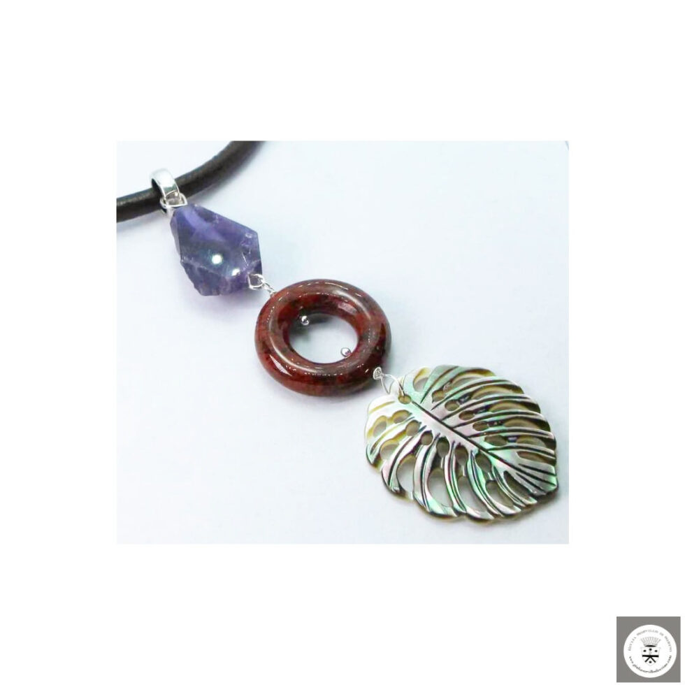 Collana in pelle con ametista grezza, diaspro rosso e foglia di madreperla di Tahiti intagliata
