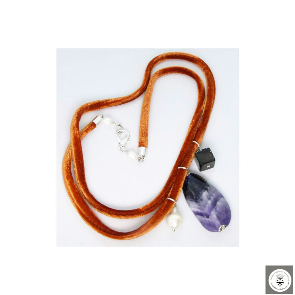 Collana in velluto ruggine con perla barocca, ametista e onice