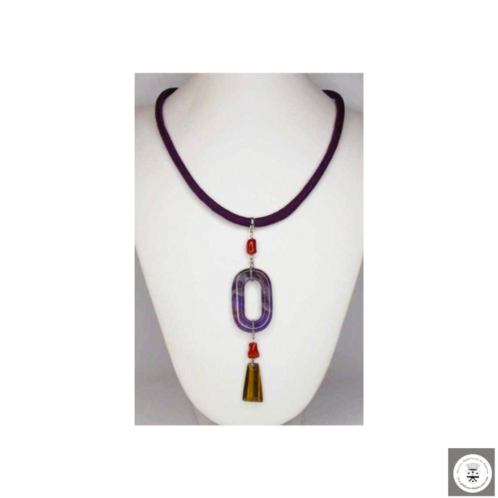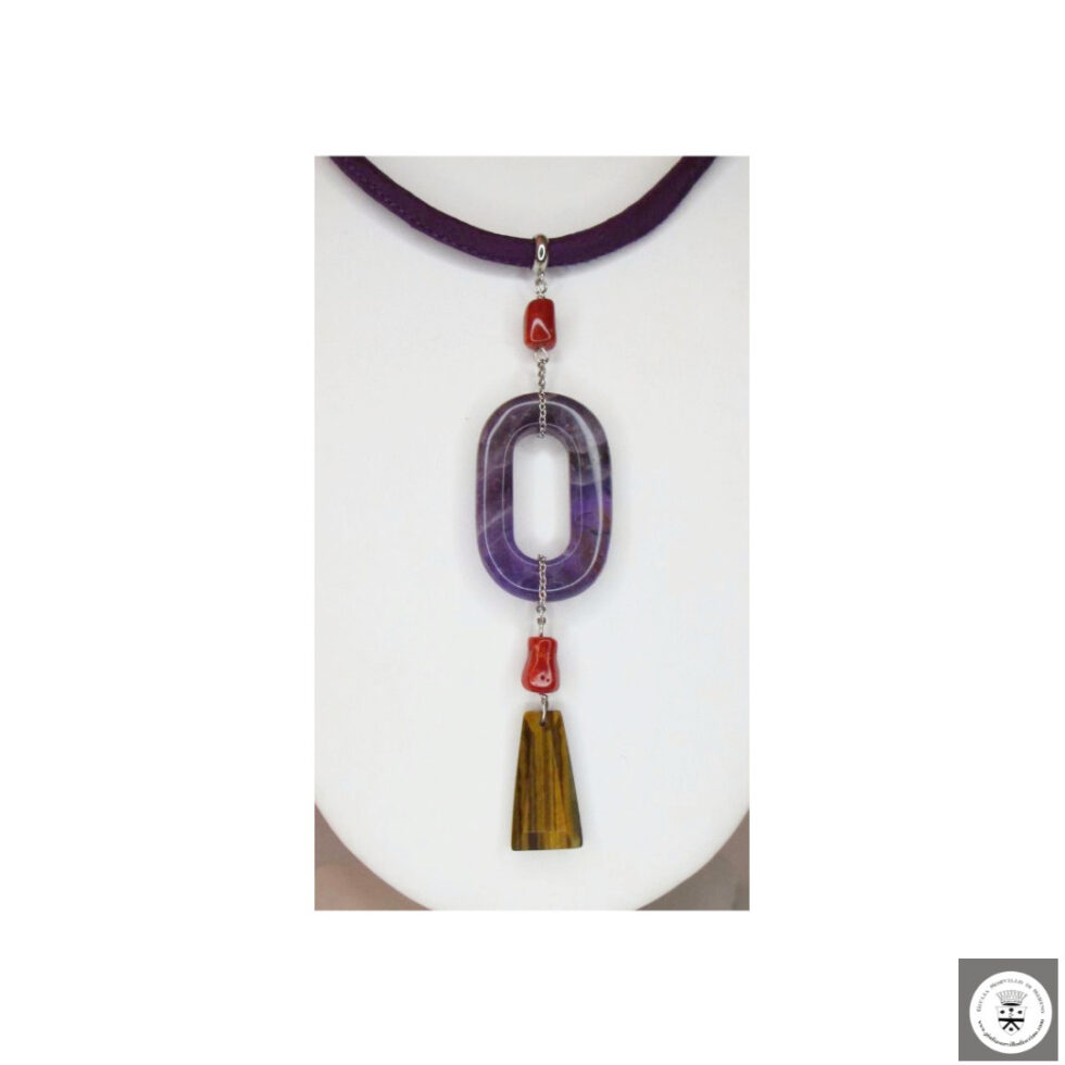Collana lunga in seta pura viola con ametista, corallo rosso e occhio di tigre