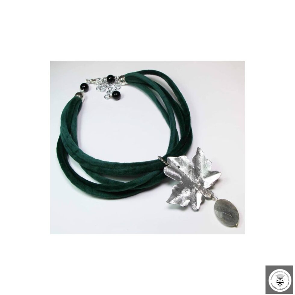 Collana di cinque fili di velluto verde con foglia d’edera in alluminio e labradorite. Chiusura in acciaio nickel free con onice e catena in alluminio.