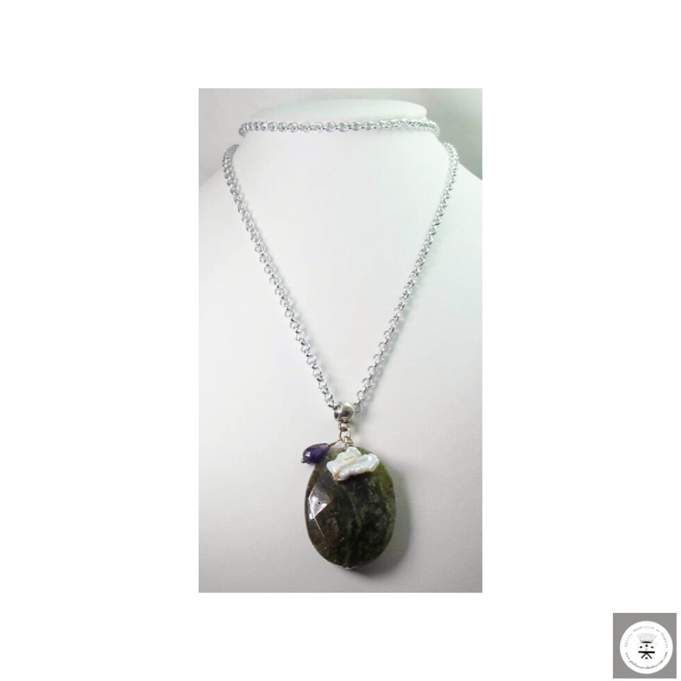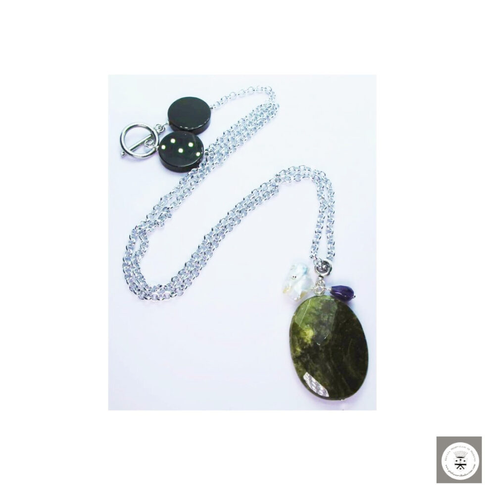 Collana lunga con peridoto, perla keshi e ametista. Catena in alluminio e chiusura nickel free con onice.