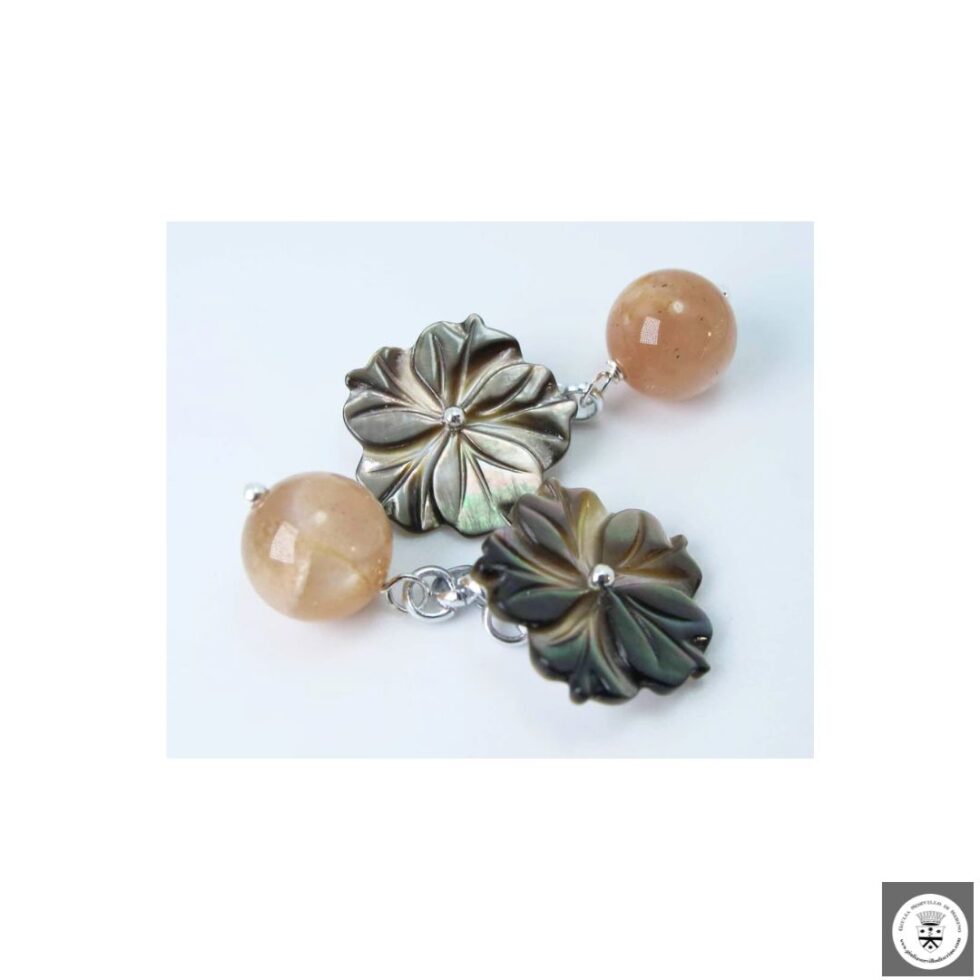 Gemelli con pietra di luna rosa e madreperla Tahiti intagliata. Catena in alluminio nickel free.