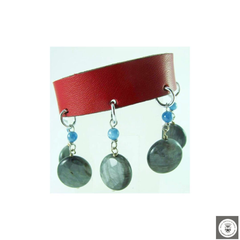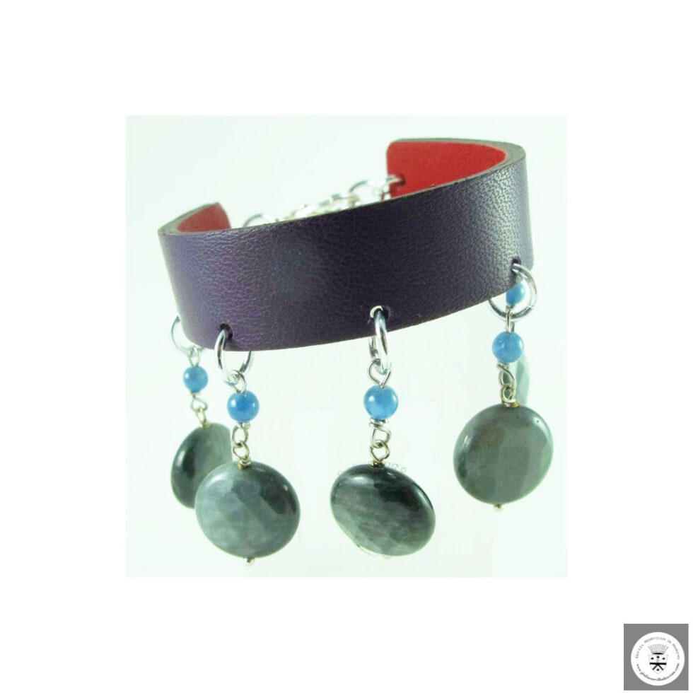 Girocollo e bracciale in pelle double-face (rosso e viola) con occhio di falco e kyanite. Chiusure in acciaio nickel free.