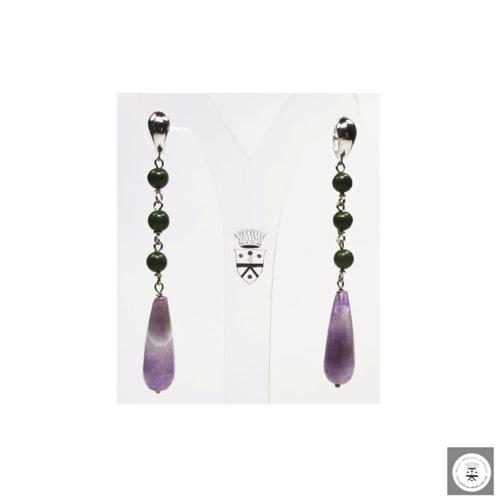 Orecchini in argento con ametista lunga a goccia e giada verde africana. Nickel free