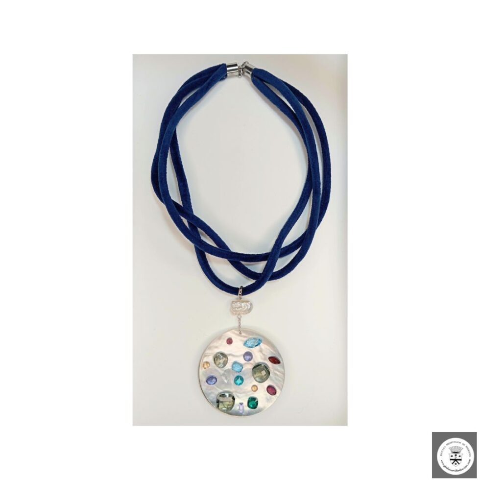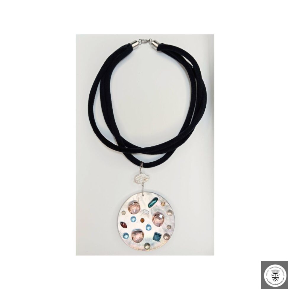 Collana multifilo di velluto con ciondolo di madreperla e cristalli Swarovski e perla keshi. Chiusura in acciaio nickel free