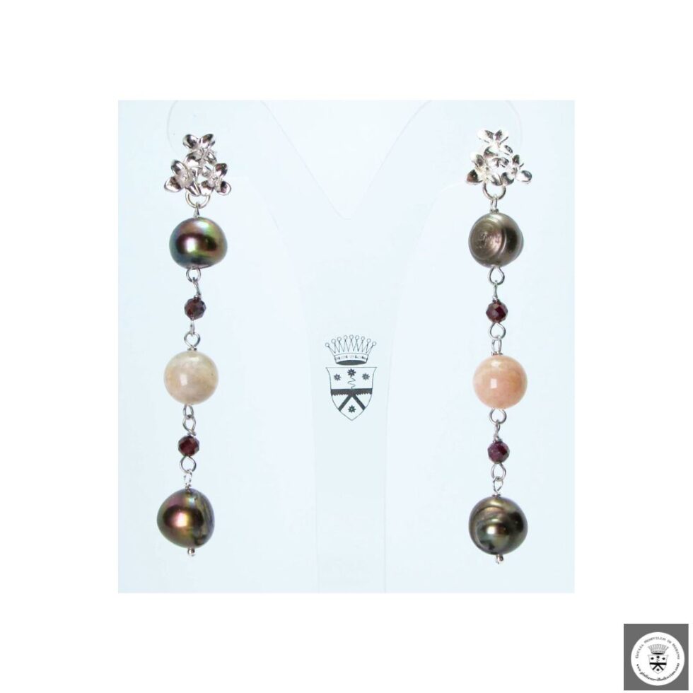 Orecchini in argento con perle barocche marroni, granato rhodolite e pietra di luna rosa. Nickel free