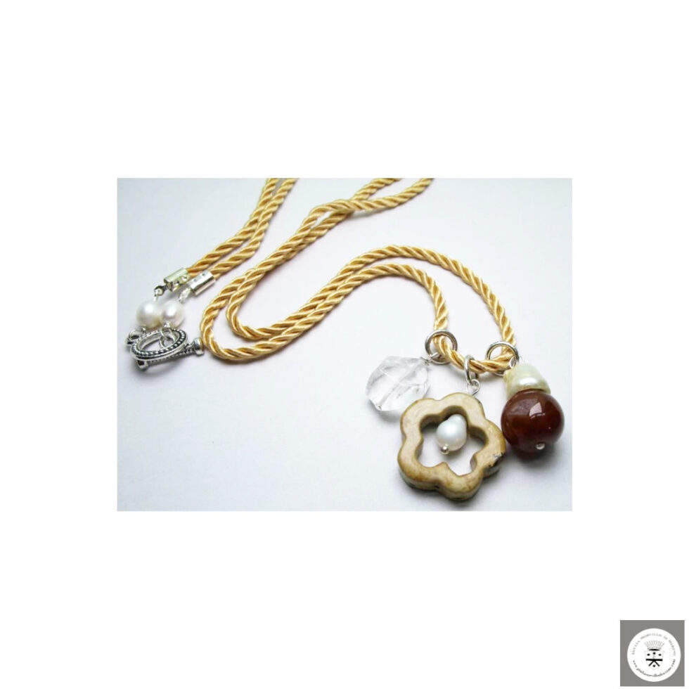 Collana in seta color champagne con diaspro, perle di fiume barocche, cristallo di rocca e corniolaย (uno o due fili).ย Chiusura nickel free con perle di fiume.