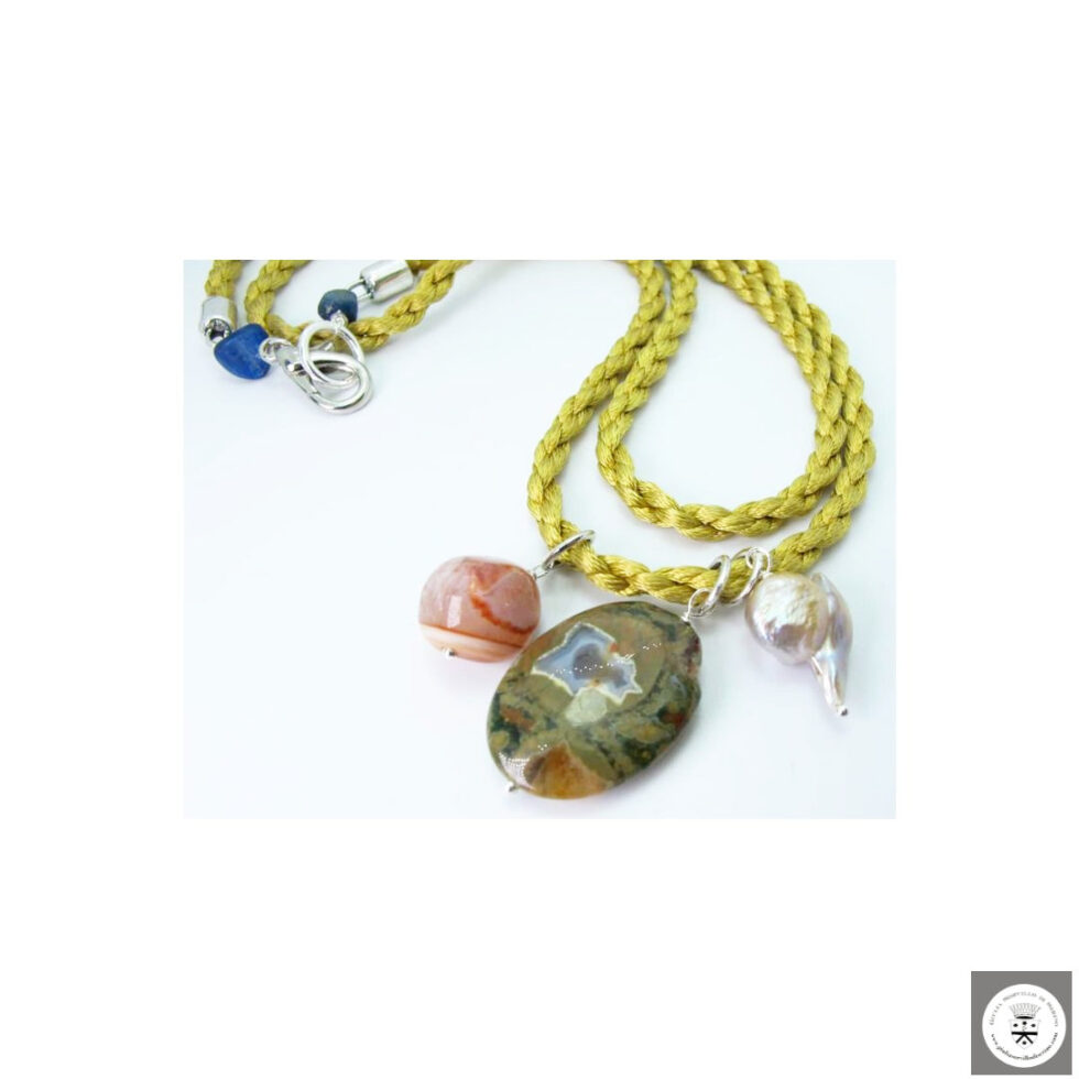 Collana in seta giallo oro con agata, rhyolite e perla barocca