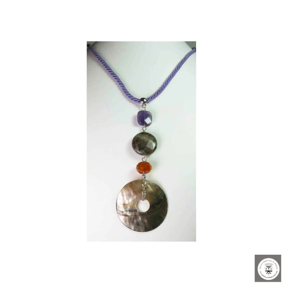 Collana in seta lilla con madreperla di Tahiti, corniola, labradorite marrone e ametista.ย Chiusura nickel free.