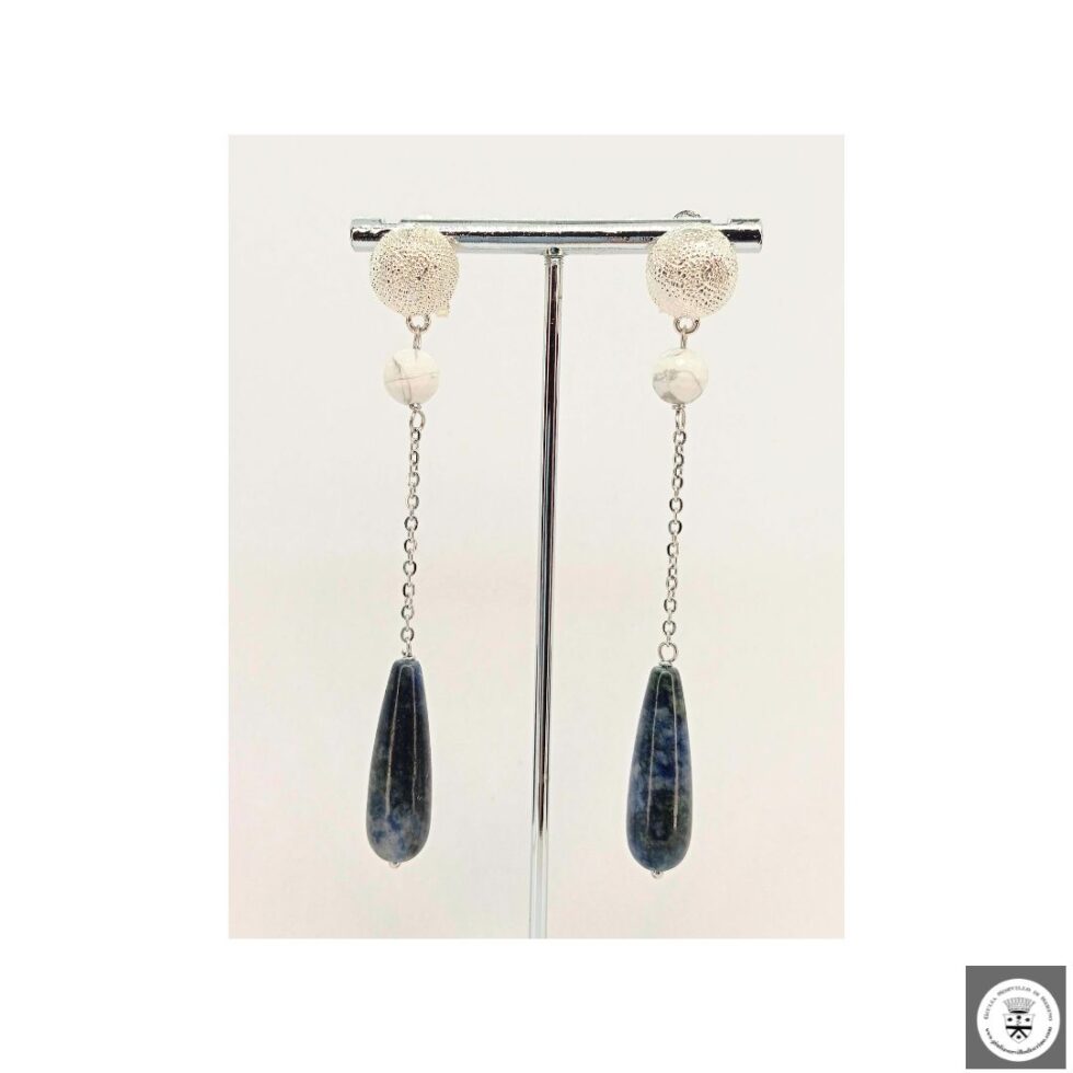 Orecchini lunghi con sodalite e howlite. Supporto in ottone rodiato nickel free.